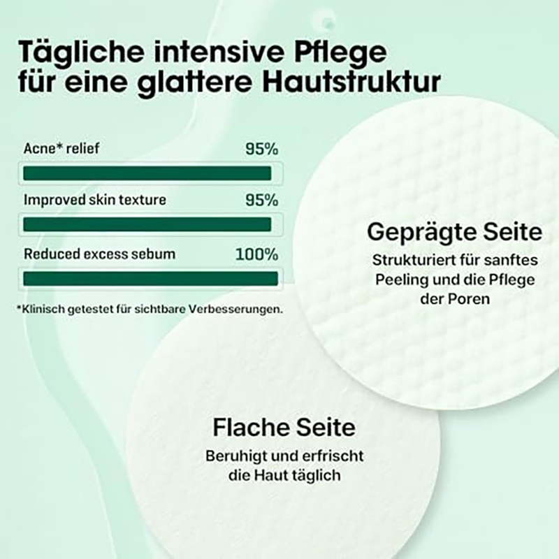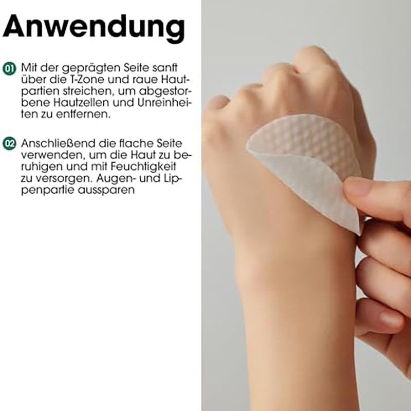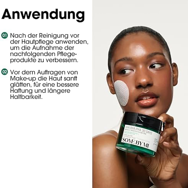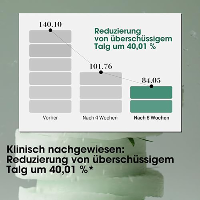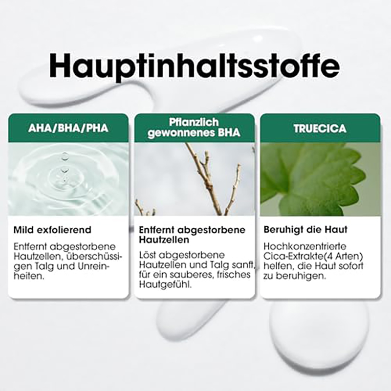 - Die milden Peelingsäuren AHA, BHA und PHA entfernen abgestorbene Hautschüppchen und entfernen Unreinheiten und Talg aus den Poren.